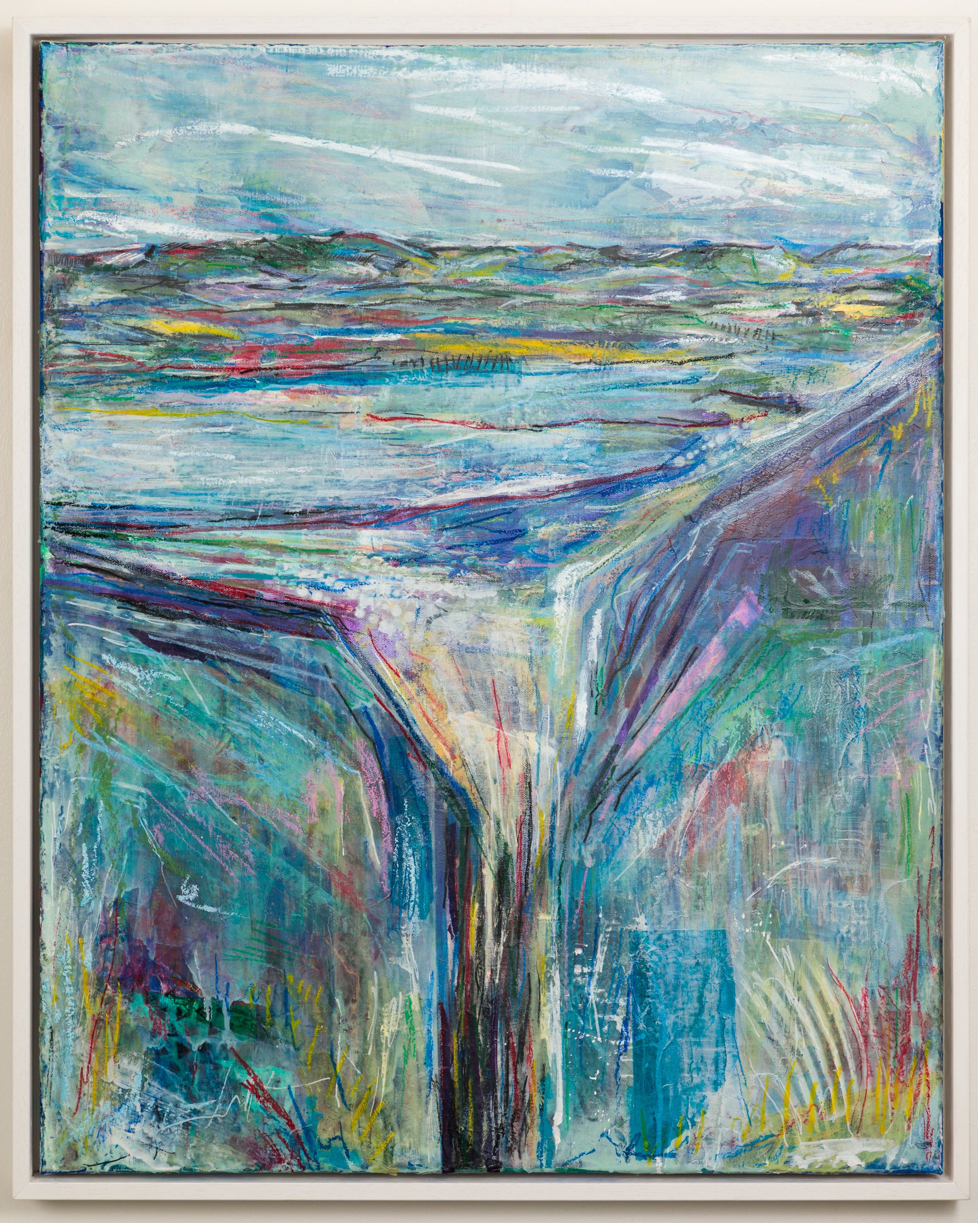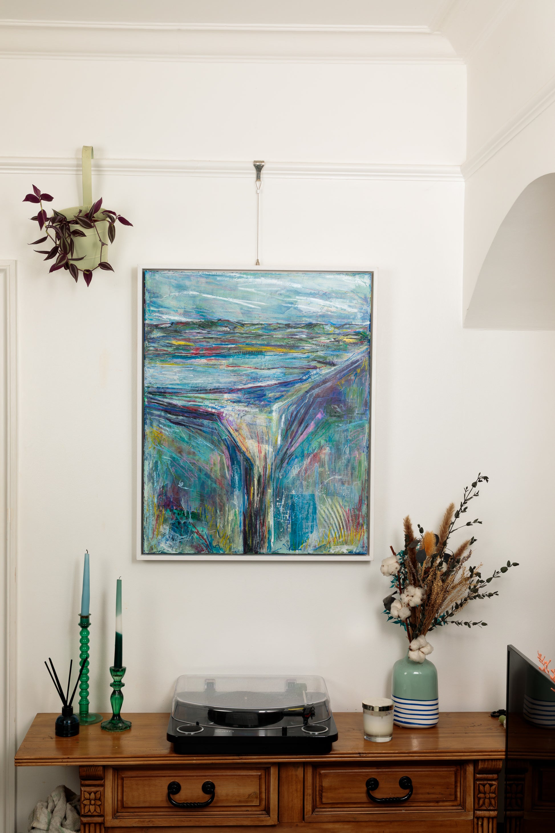 This piece balances a strong sense of cascading movement with a calmer, grounding horizon. It evokes the presence of a waterfall or landscape without resorting to literal depiction. The central cascade form anchors the composition, while the cohesive palette creates harmony across the surface. The dialogue between energy and stillness makes this work accessible to collectors while retaining conceptual depth, a meditation on fearlessness through balance.
